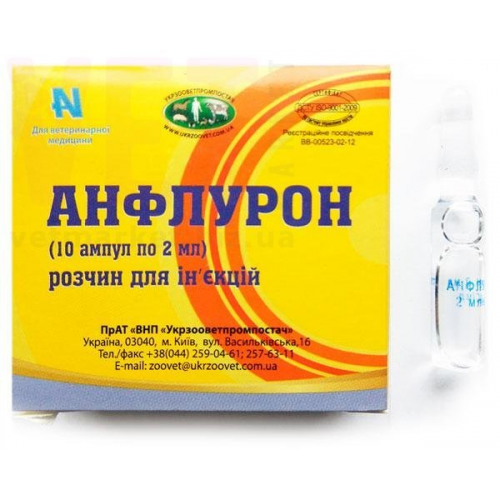 予防投与として、アンフルロンはショック投与量の1/2を2週間に1回筋肉内投与するか、または1頭あたり負荷投与量の割合で薬剤溶液を飲水投与する。飲水投与の場合、アンフルロンは家畜1頭につき冷水(煮沸または静置)で希釈し、すべての家畜が希釈液を1回ずつ使用するようにする。薬剤溶液は使用前に調製し、4~8℃で24時間以内に保存する。